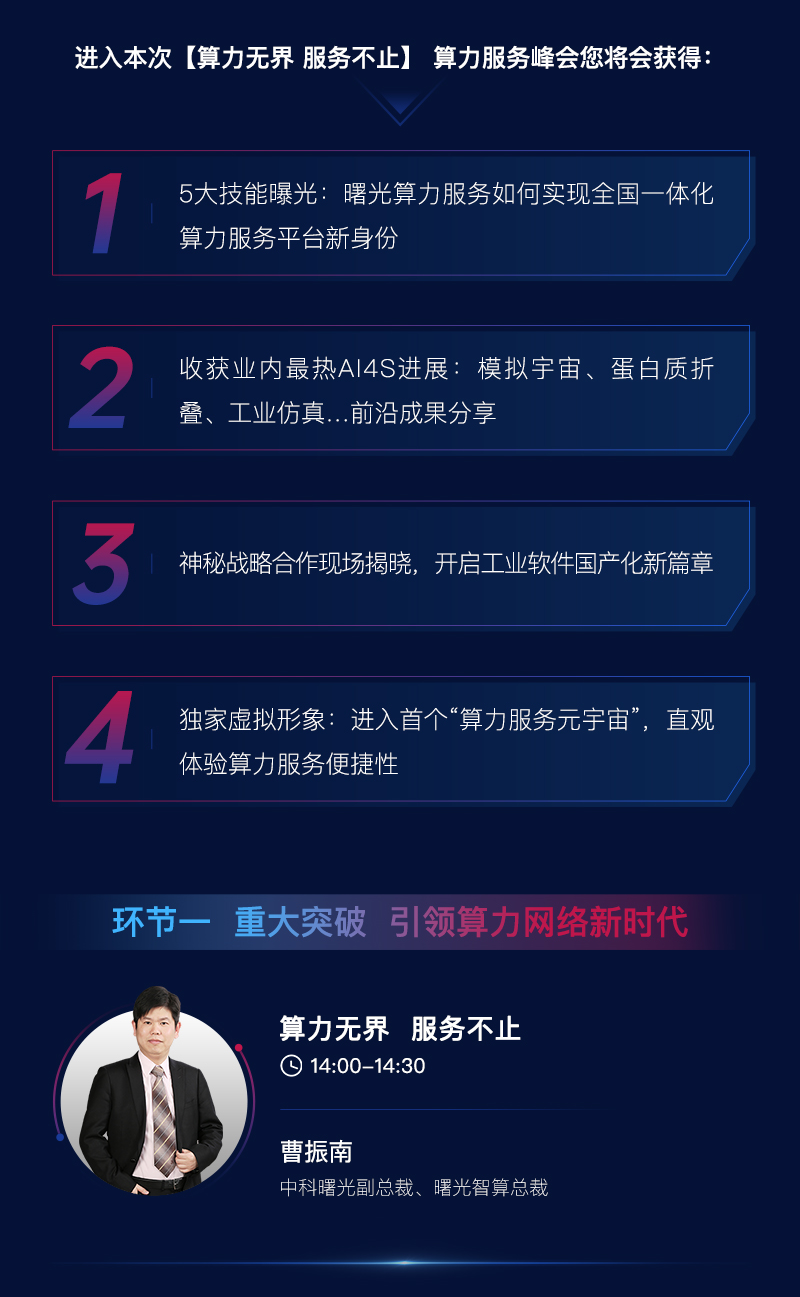 曙光智算作為中科曙光布局算力服務(wù)市場子公司,在成立一周年之際,誠邀產(chǎn)業(yè)專家、前沿用戶、行業(yè)伙伴齊聚一堂,參與我國首個(gè)聚焦算力服務(wù)市場與算力服務(wù)網(wǎng)絡(luò)的專題峰會。